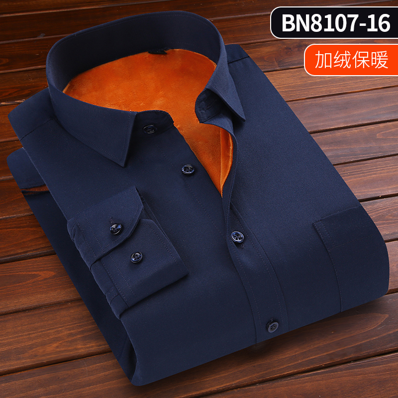冬季長袖加絨加厚男士保暖襯衫中年藏藍條紋保暖襯衣男爸爸裝大碼