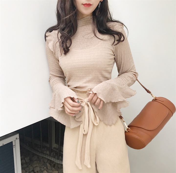 / 2018秋裝新款甜美復古chic彈力修身荷葉袖圓領韓版氣質百搭上衣女