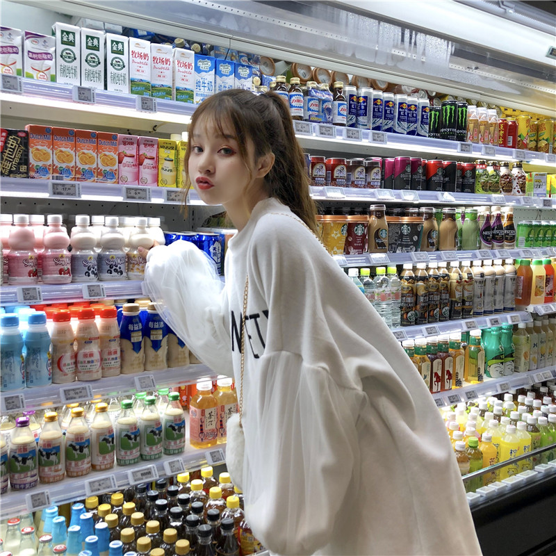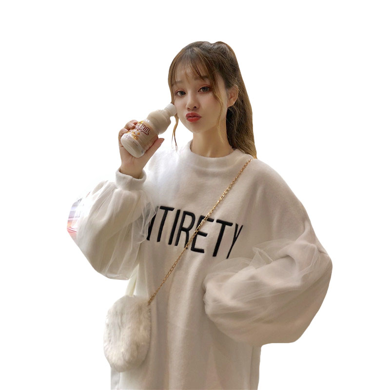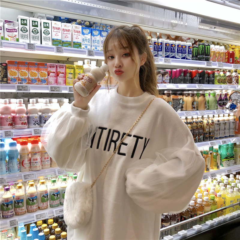 / 秋冬女裝韓版中長款慵懶風寬松字母刺繡網紗拼接套頭衛衣上衣外套