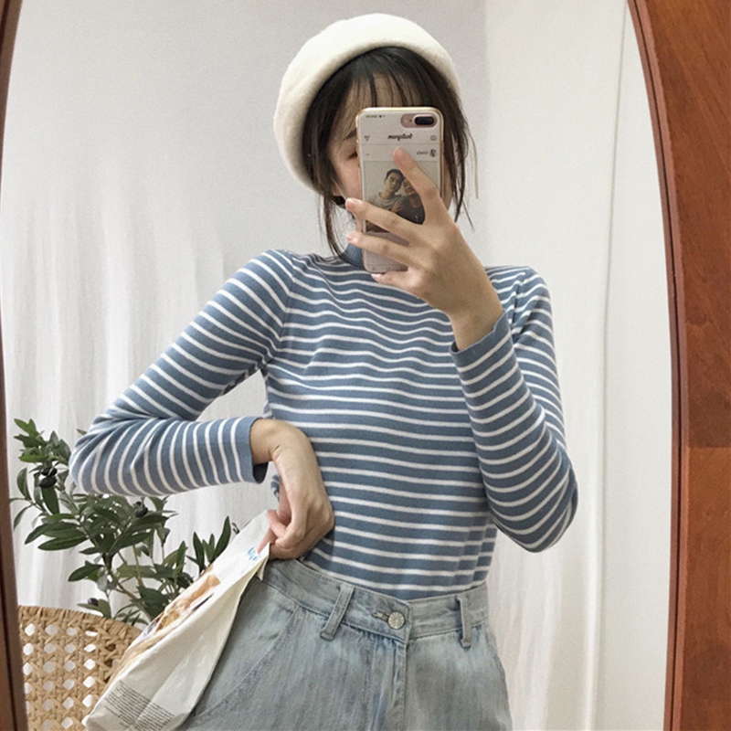 / 小高領長袖針織衫女秋冬裝新款修身顯瘦打底衫學生時尚條紋上衣潮