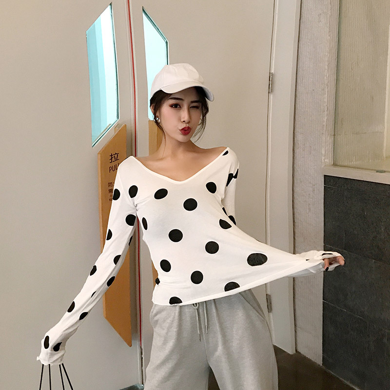/ 時尚百搭復古2018秋裝新款韓版上衣女港味V領波點打底顯瘦長袖T恤