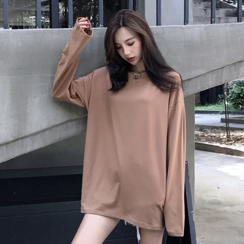 / 糖果色寬松長袖T恤女秋裝新款韓版學院風簡約圓領中長款上衣體恤