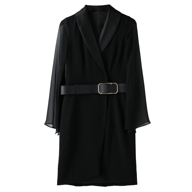 / 2018夏網紗拼接直筒西裝連衣裙女中長款網紗袖子收腰名媛氣質裙子