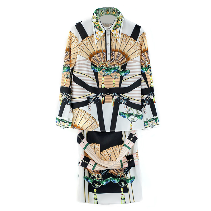 / 歐洲站名媛氣質長袖印花釘珠襯衫高腰顯瘦半身裙重工套裝兩件套潮
