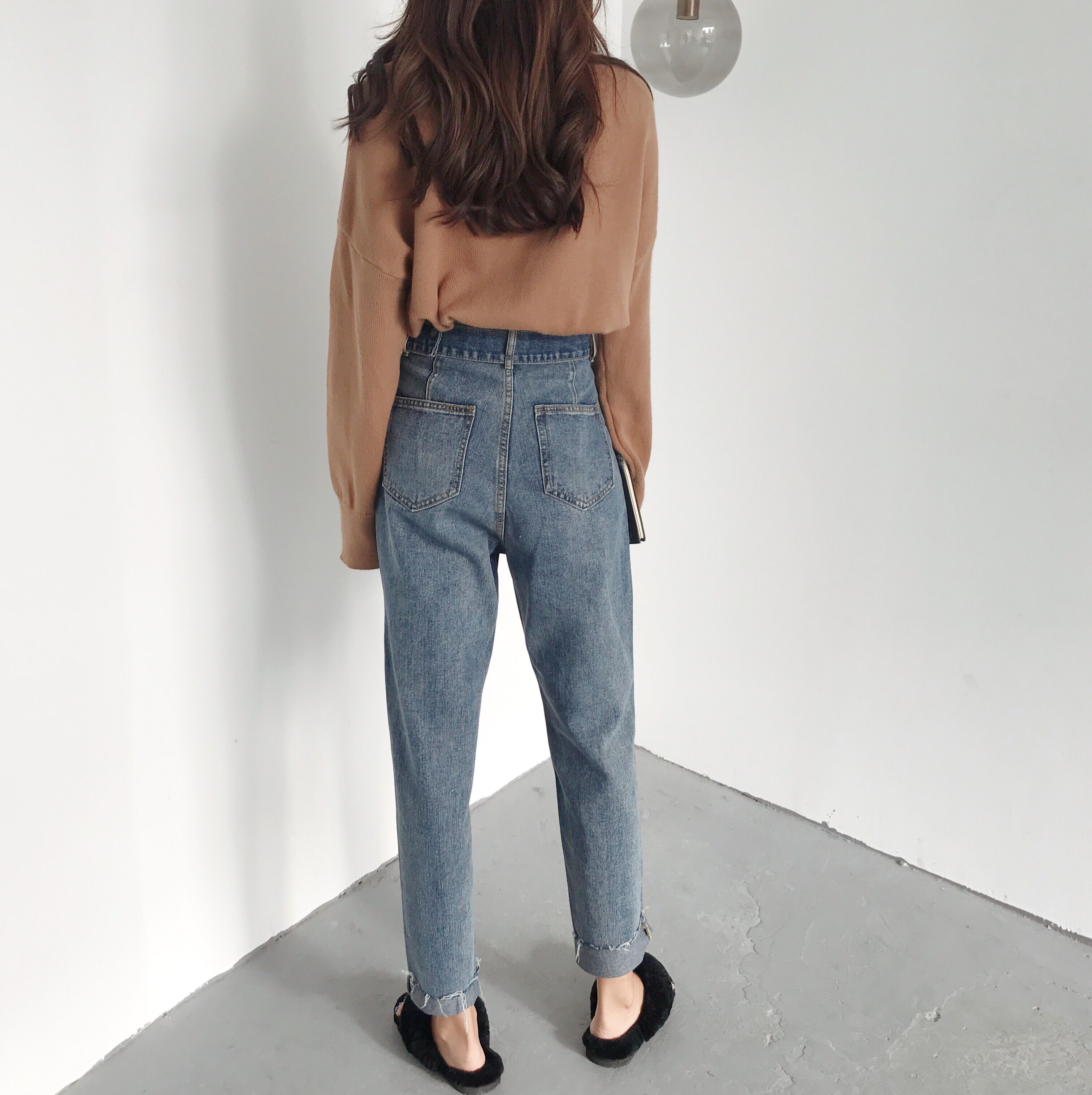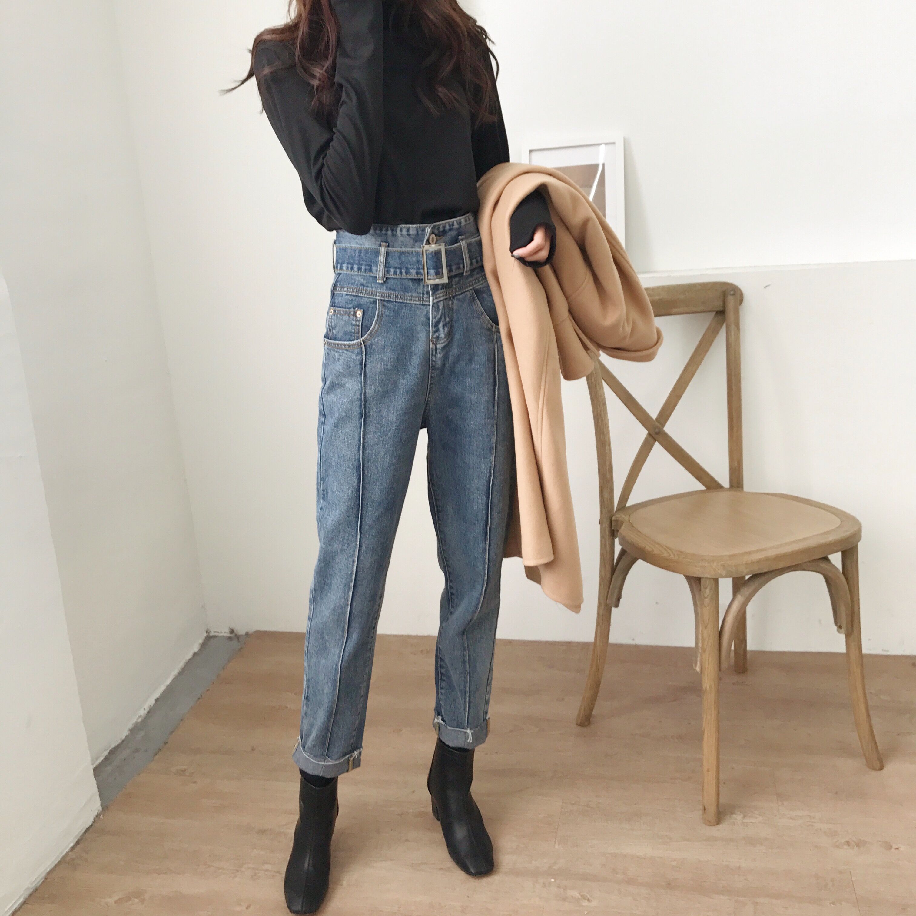 / 褲子新款秋裝港風復古腰帶高腰寬松顯瘦BF休閑毛邊牛仔褲哈倫褲女