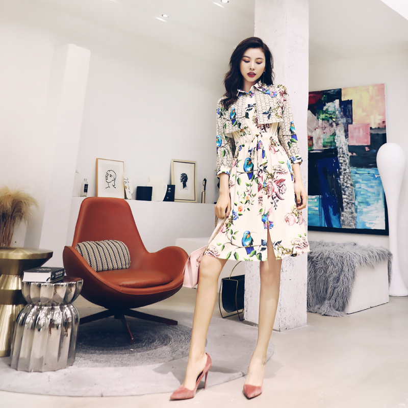 / S秀文藝風2018秋季新款花色長袖蝴蝶結系帶波浪印花收腰連衣裙潮
