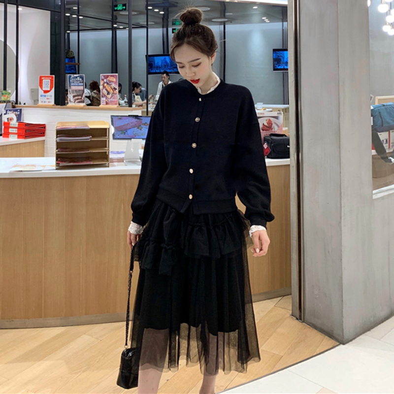 / 氣質女神兩件套秋冬裝新款時尚蕾絲拼接外套高腰顯瘦網紗A字裙子