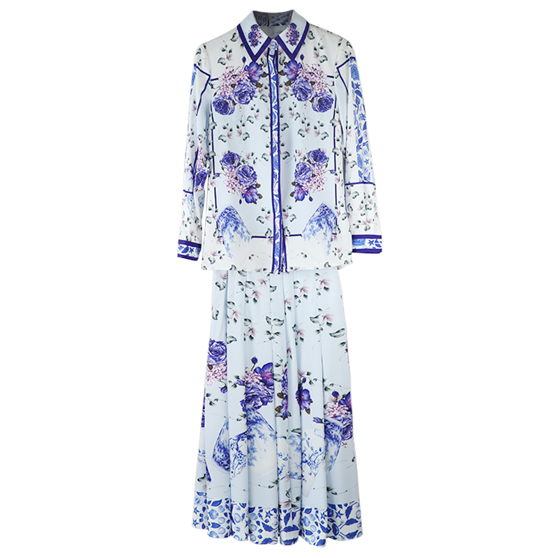 / 網紅港味名媛氣質復古印花顯瘦長袖印花襯衫百褶半身裙兩件套裝女
