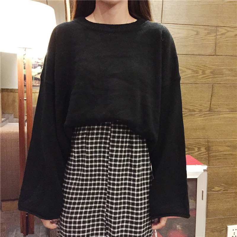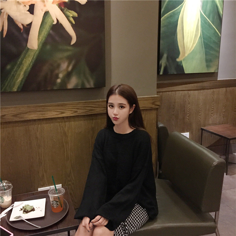 秋裝韓版女裝新款寬松顯瘦圓領套頭上衣黑色休閑長袖針織衫毛衣女