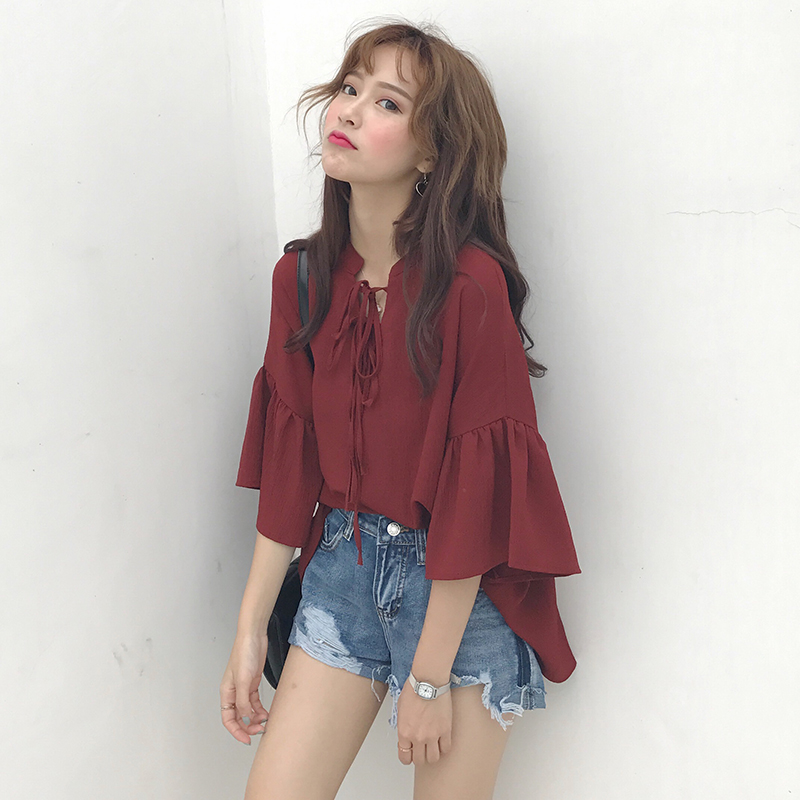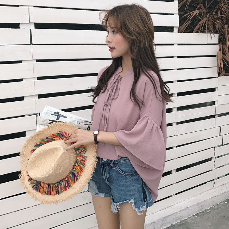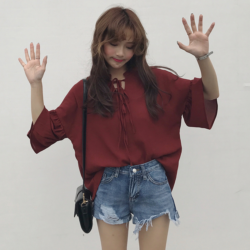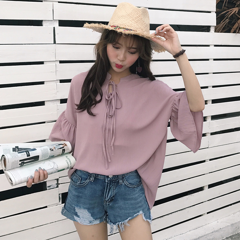 / 新款夏季韓版女裝復古風系繩花邊袖上衣休閑百搭簡約純色雪紡襯衫