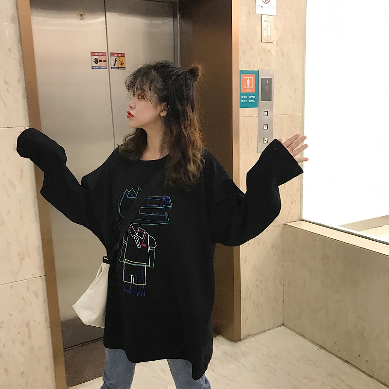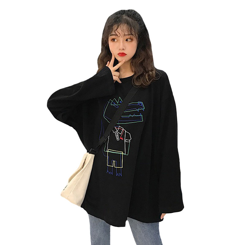 秋季女裝韓版原宿風卡通恐龍刺繡寬松百搭長袖套頭衛衣上衣外套潮