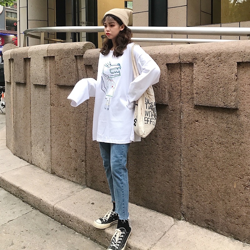 / 秋季女裝韓版原宿風卡通恐龍刺繡寬松百搭長袖套頭衛衣上衣外套潮