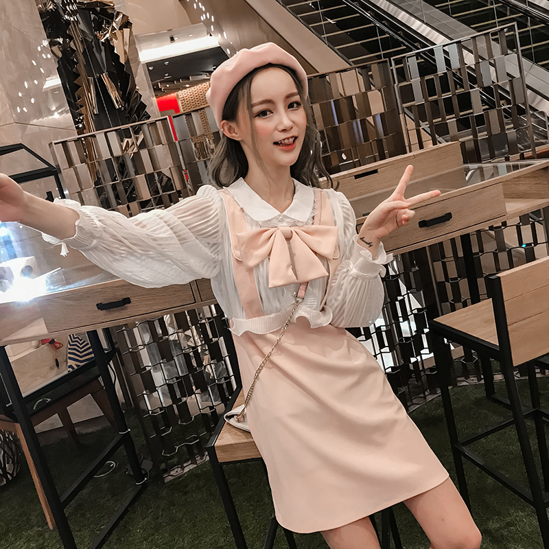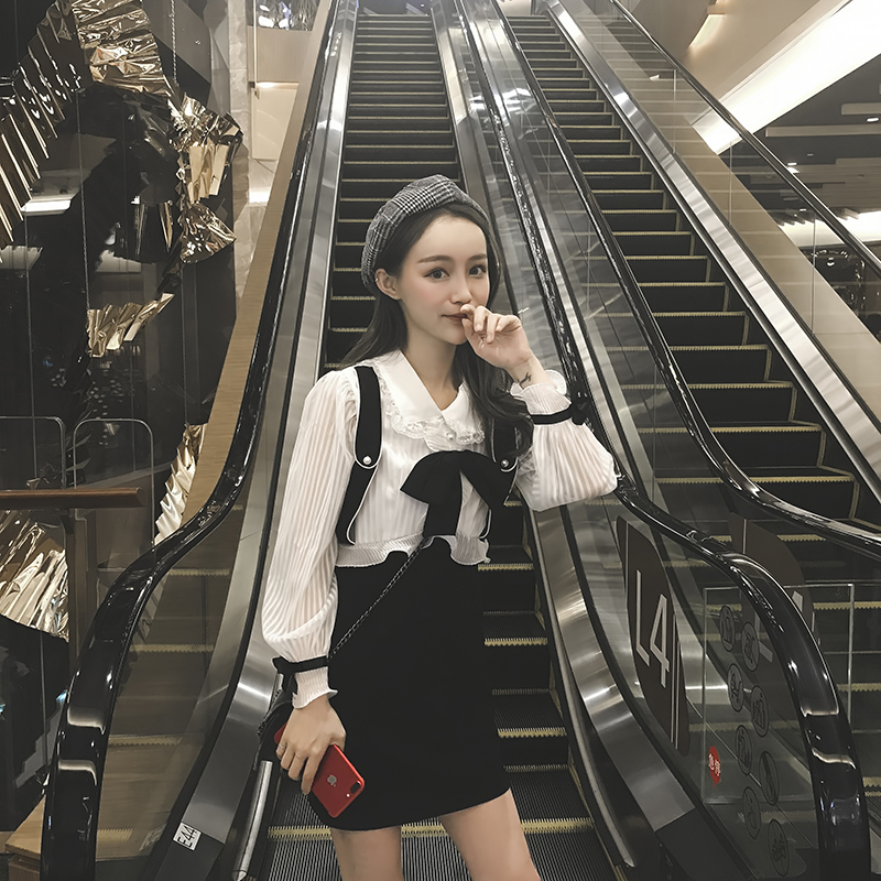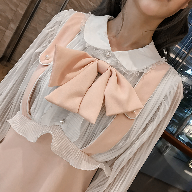 仙女甜美復古chic秋裝韓版修身長袖荷葉邊黑白拼接蝴蝶結連衣裙潮