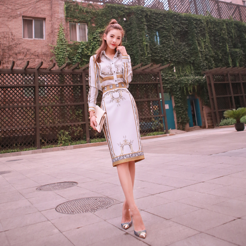 名媛氣質淑女2018新款女印花復古上衣半身裙子時髦兩件套時尚套裝