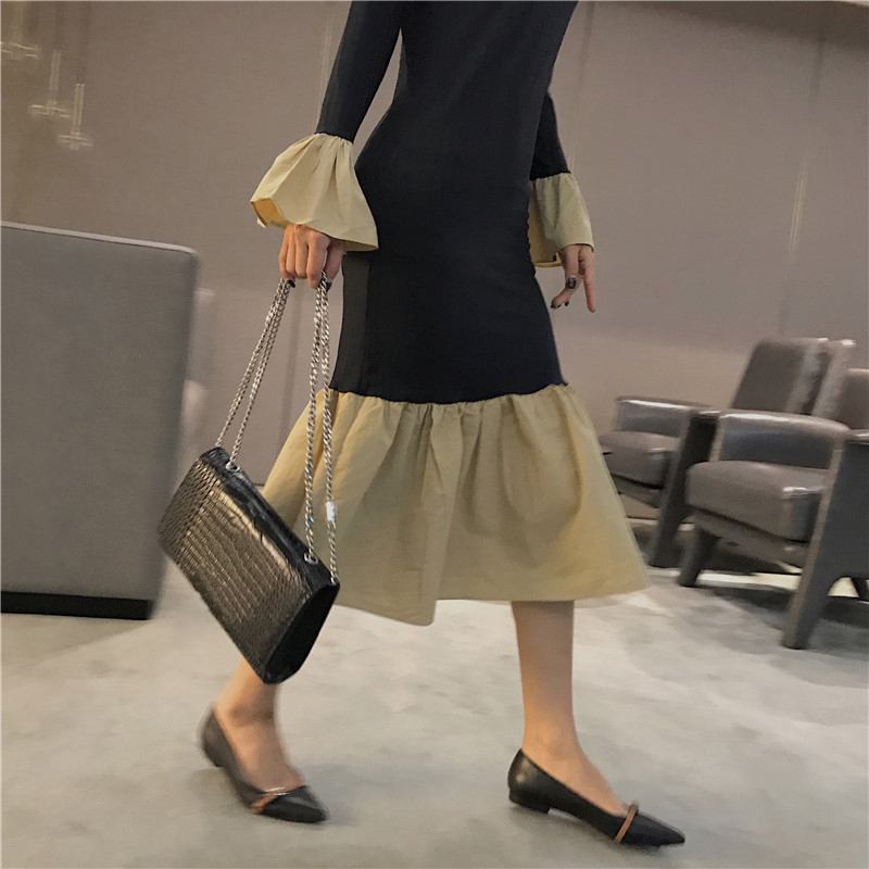 / 晚晚風秋季新款修身顯瘦高領喇叭袖針織拼接荷葉邊chic風連衣裙女