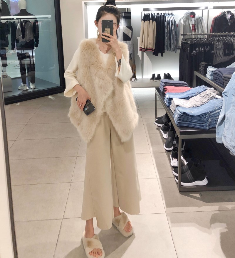 白色針織衫|杏色闊腿褲|杏色馬甲