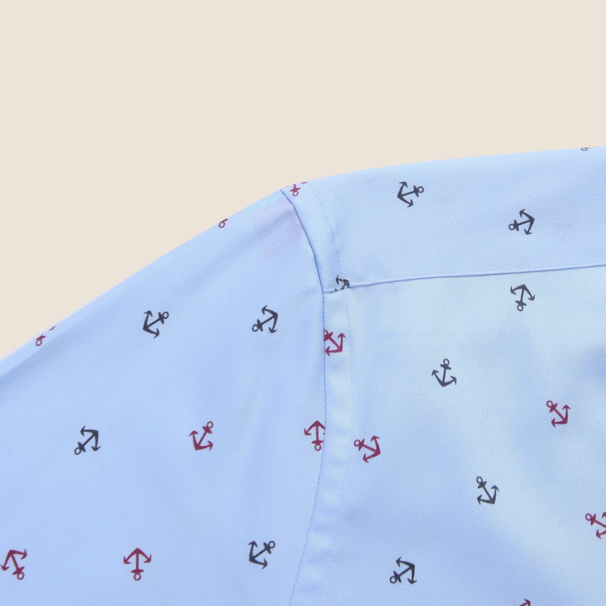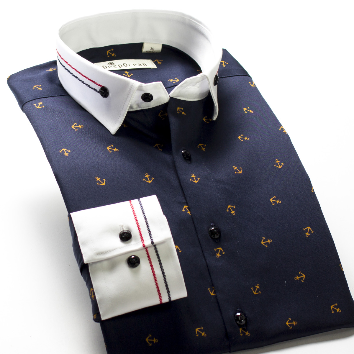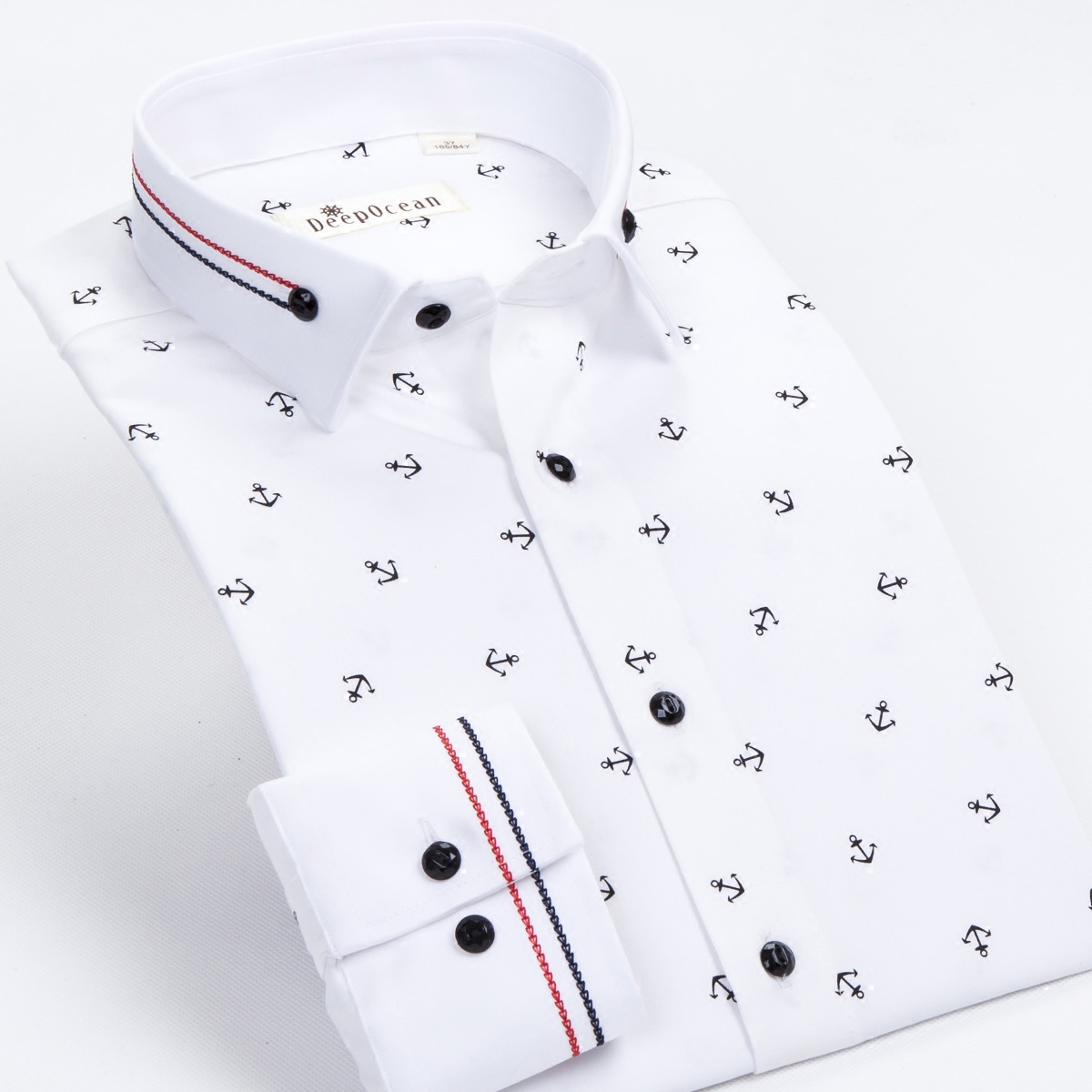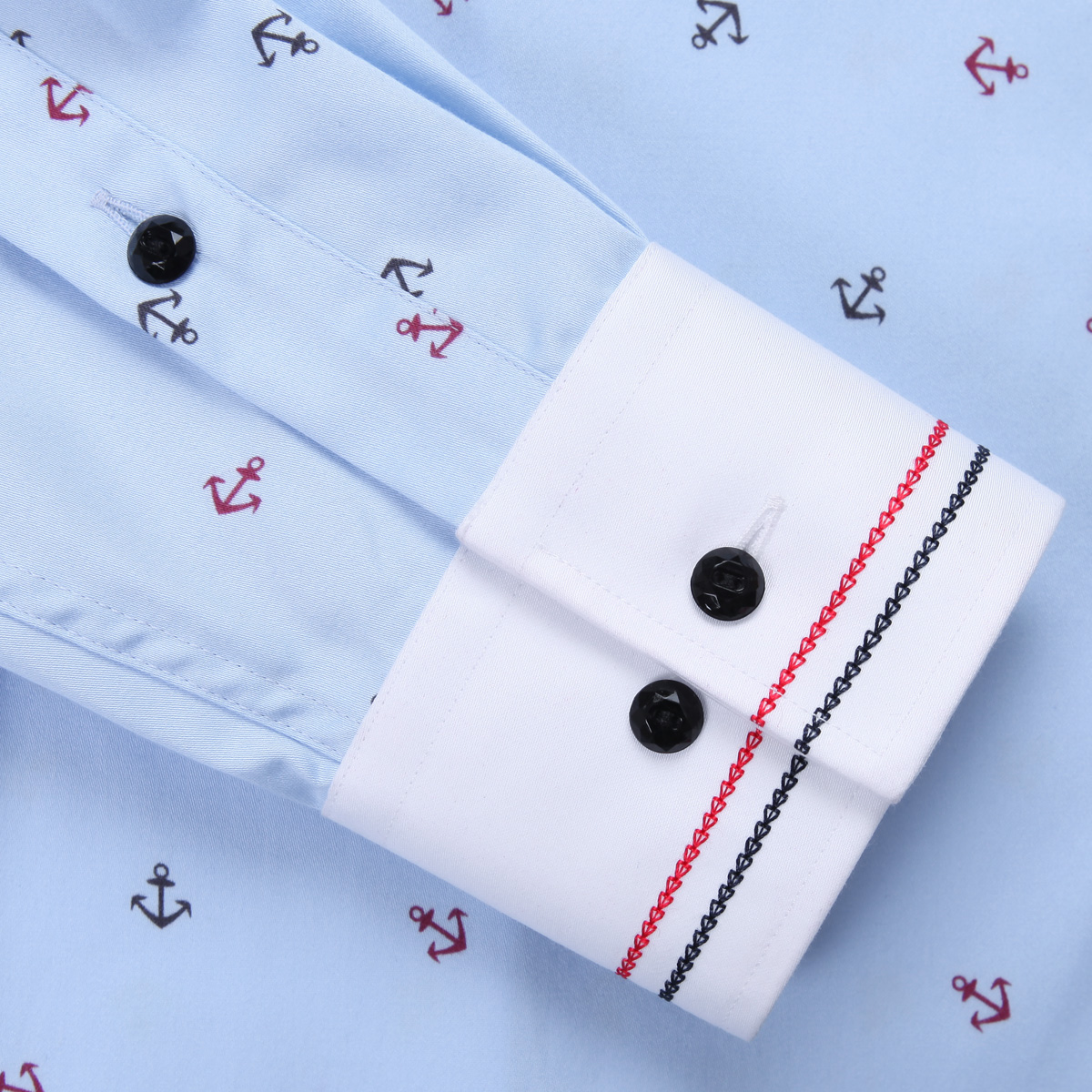 深海秋裝男士襯衫男長袖天藍色絲光棉印花免燙休閑修身襯衣男裝潮