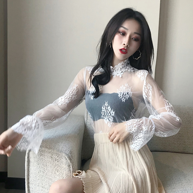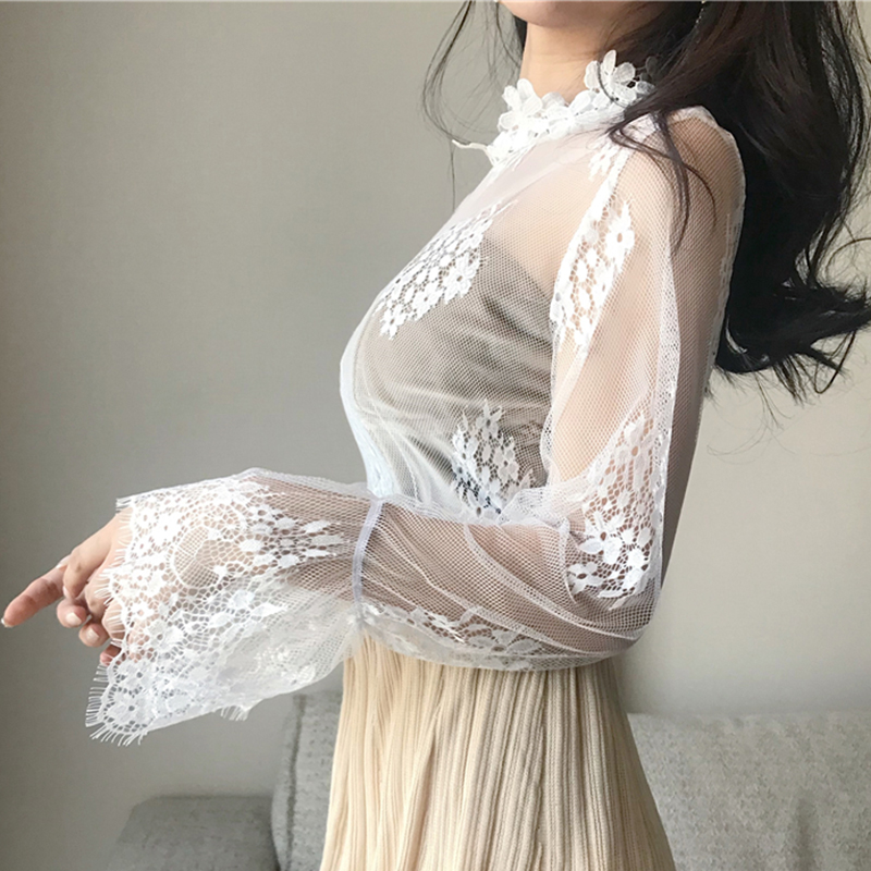 / 蕾絲透視拼接花邊氣質網紗上衣秋冬女裝新款韓版時尚喇叭長袖T恤