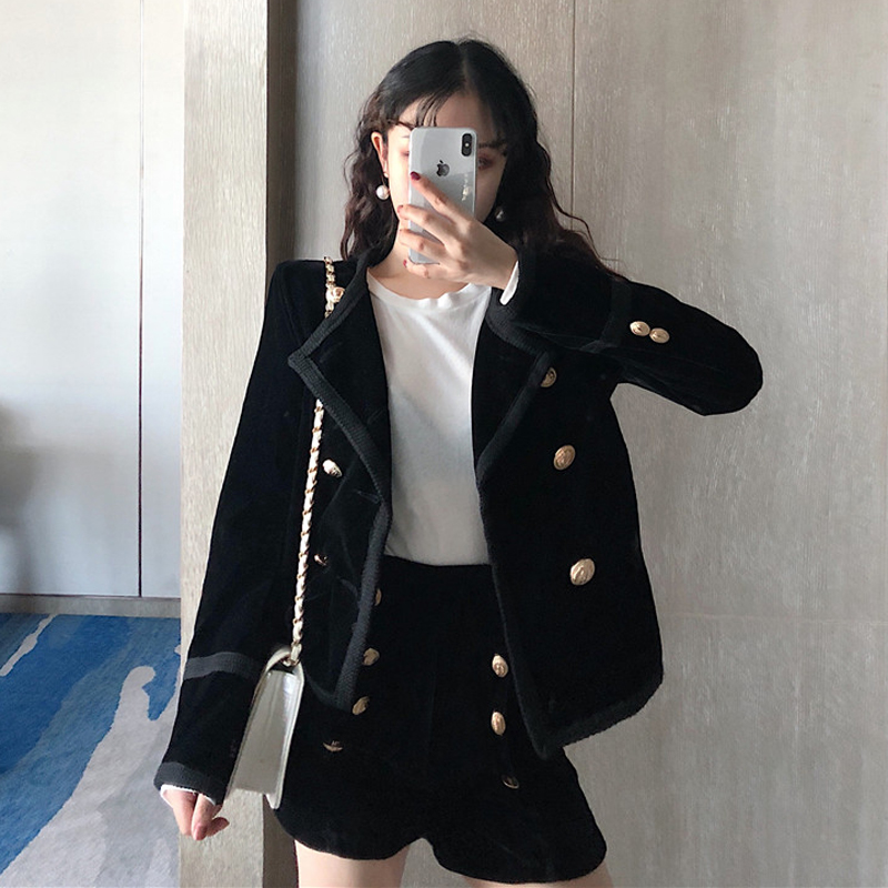 2018秋季港味新款名媛小香風金絲絨外套排扣金絲絨短褲時尚套裝女
