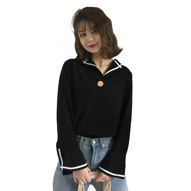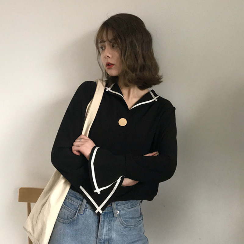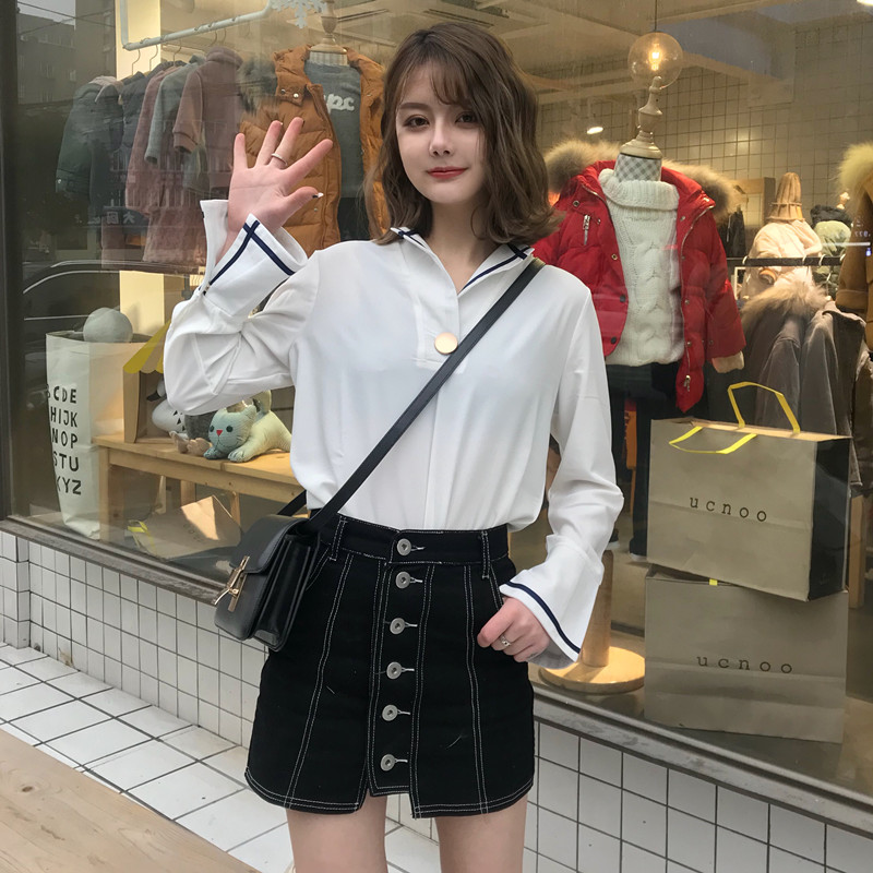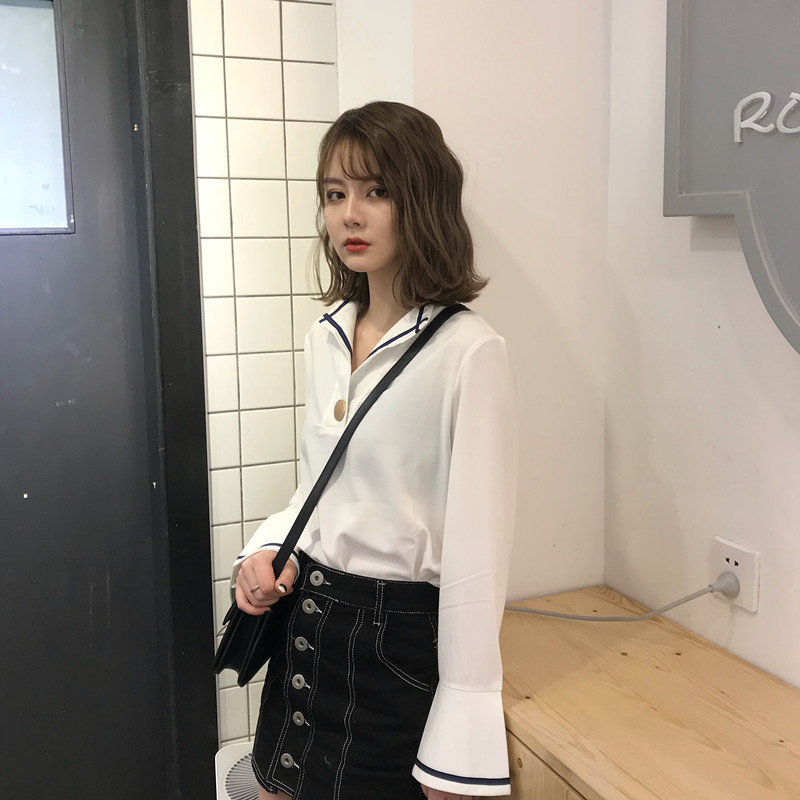 / 秋季女裝韓版一粒扣條紋拼接喇叭袖氣質襯衫學生長袖休閑襯衣上衣