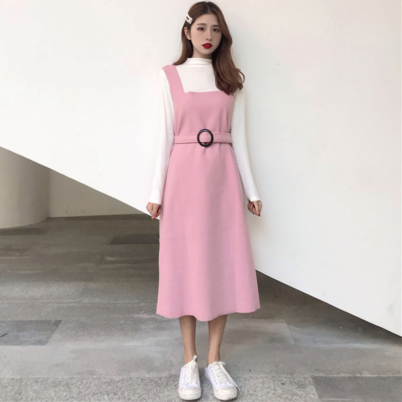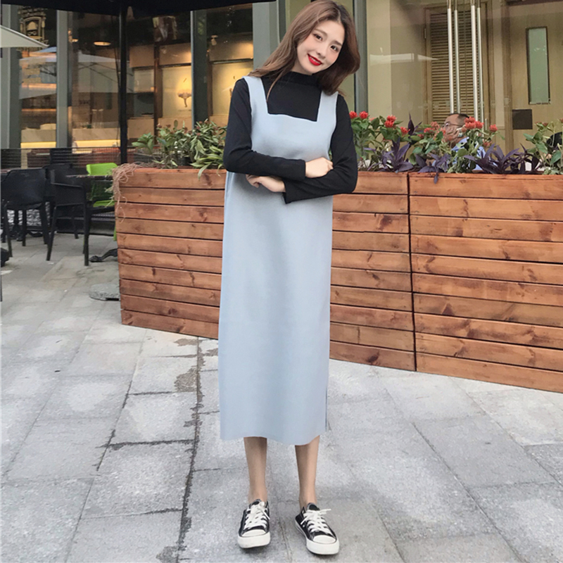 赫本風套裝女秋冬新款修身黑色長袖打底衫上衣顯瘦呢子背帶連衣裙