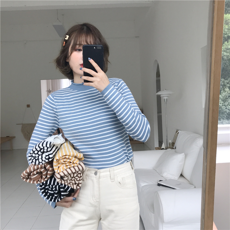 秋冬韓版條紋修身顯瘦上衣女打底衫chic套頭長袖針織衫半高領毛衣