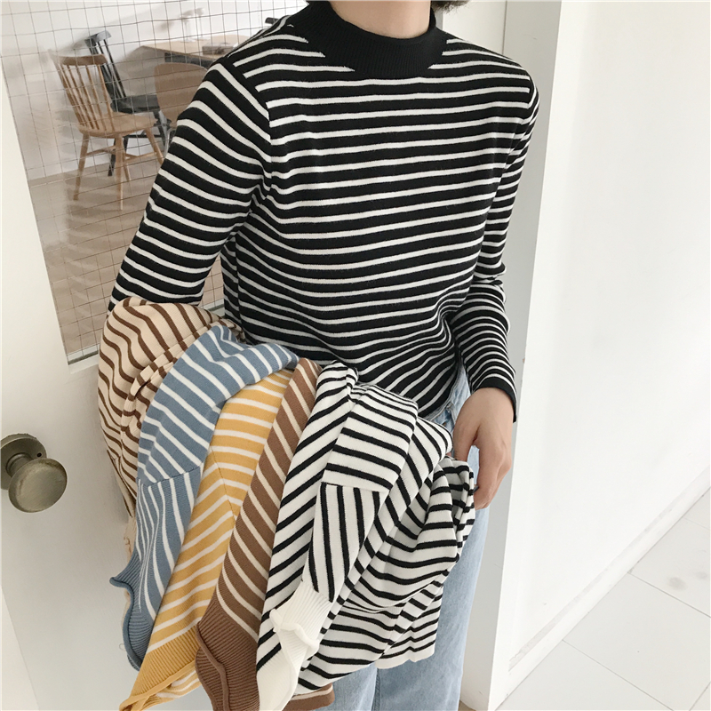 / 秋冬韓版條紋修身顯瘦上衣女打底衫chic套頭長袖針織衫半高領毛衣