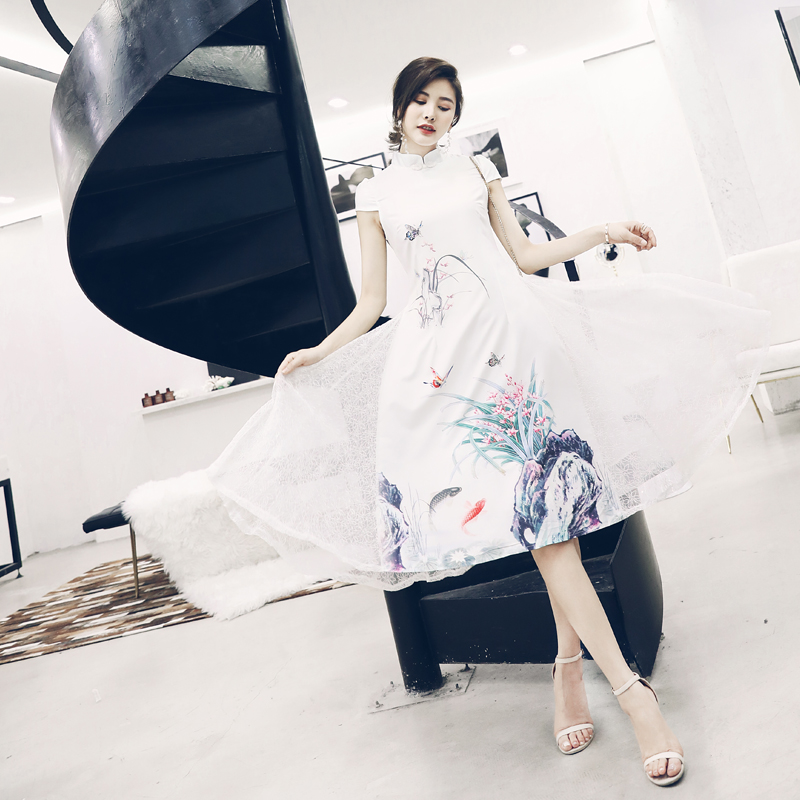 s秀中國風改良旗袍女2018新品復古印花蕾絲拼接大擺裙連衣裙夏