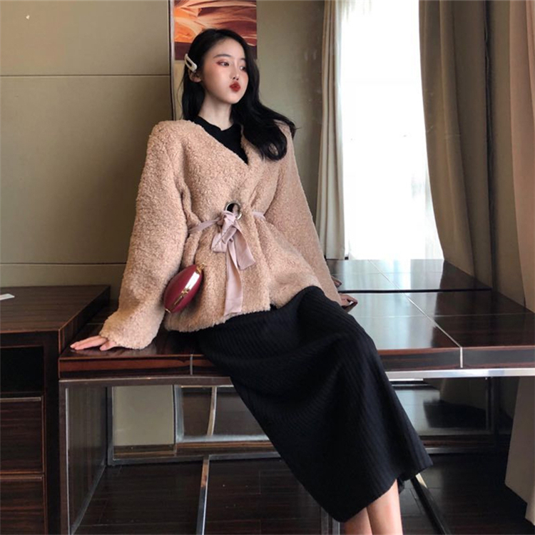韓版加厚保暖寬松百搭羊羔毛大衣女+打底針織衫+半身裙時尚三件套