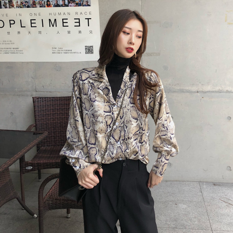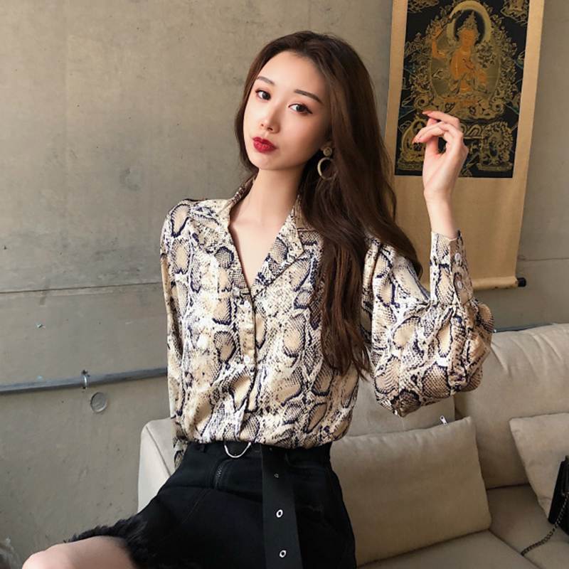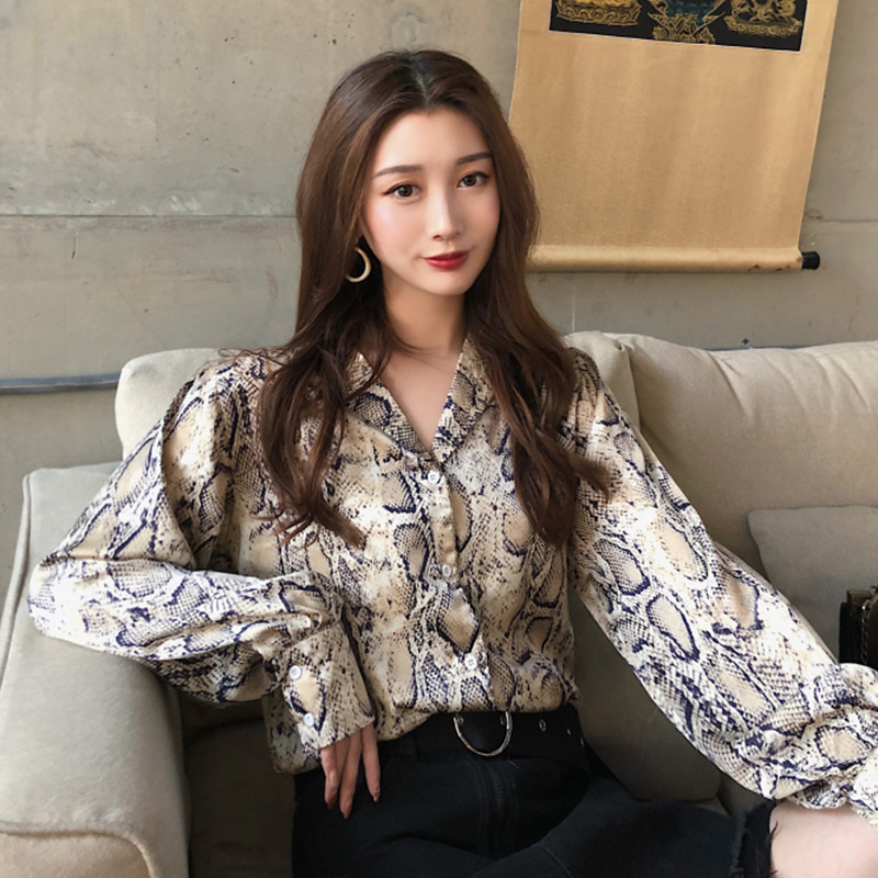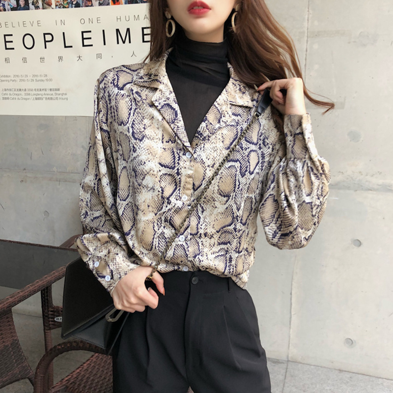 chic時尚蛇皮紋長袖襯衣女秋冬裝2018新款氣質百搭V領襯衫上衣潮