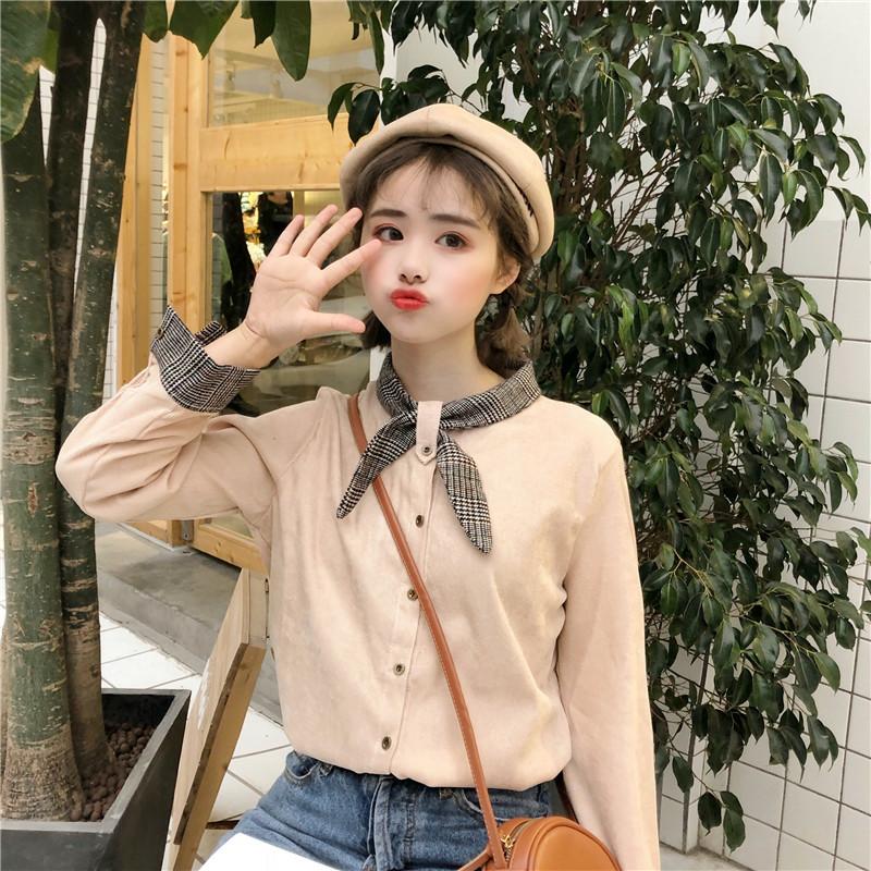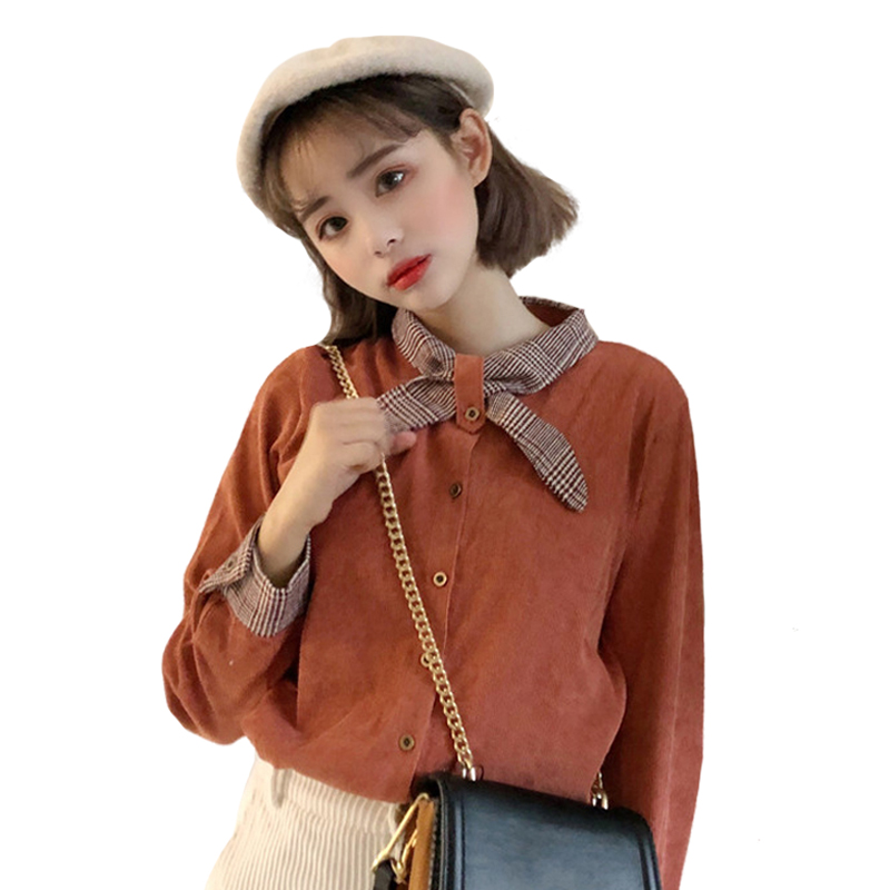 / 秋裝女裝韓版氣質小清新系帶蝴蝶結領燈芯絨長袖襯衣休閑上衣襯衫