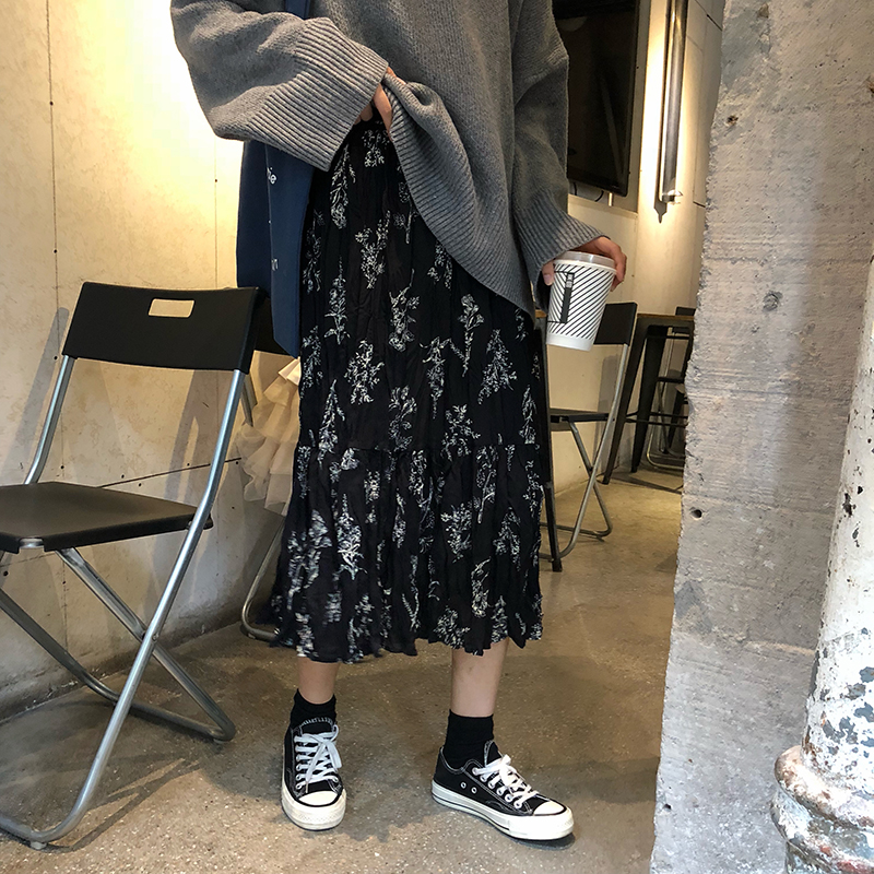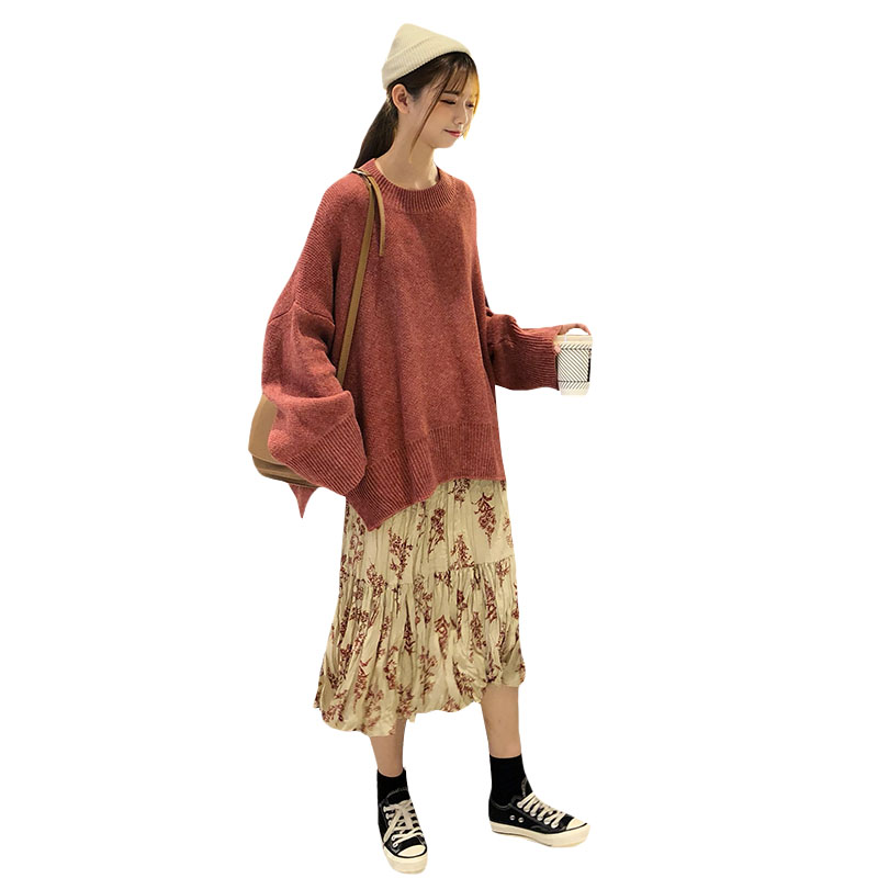 / 韓版時尚休閑套裝秋季純色針織毛衣+高腰碎花百褶半身裙兩件套女
