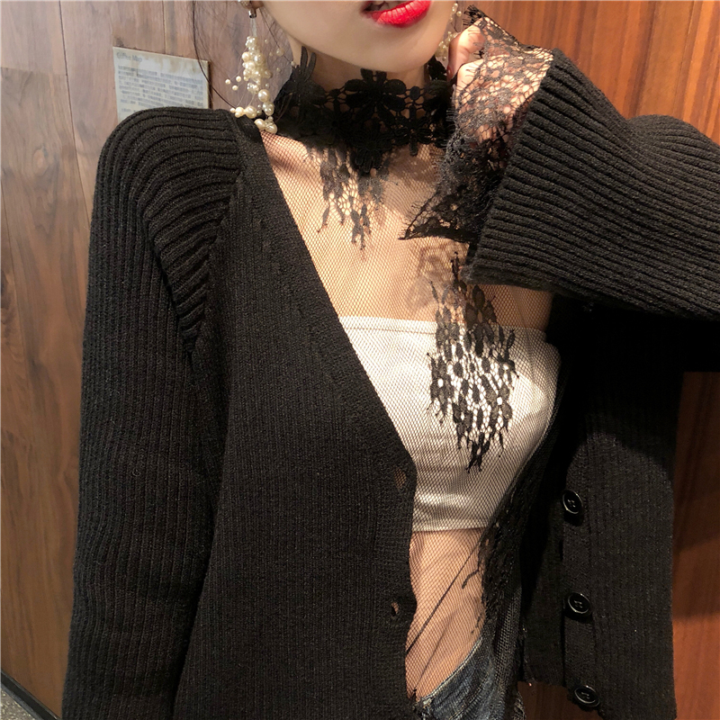 / 氣質女神兩件套冬裝新款時尚透視蕾絲打底衫寬松V領長袖針織開衫