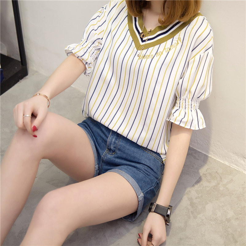 / 夏裝新款女裝上衣春季韓版V領豎條紋短袖t恤女白色寬松體恤衫