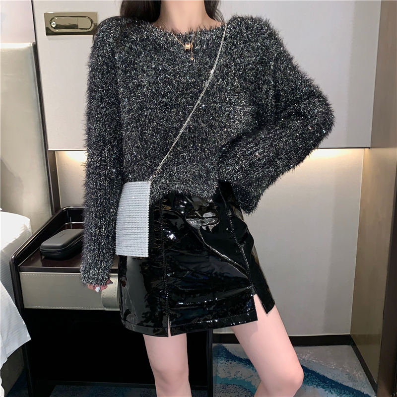 / 新款亮閃閃短款毛衣港風時尚套裝百搭亮皮半身裙包臀裙chic兩件套