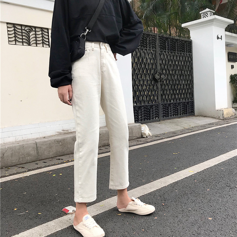 學生牛仔褲子秋裝女2018新款韓版寬松高腰直筒褲潮百搭休閑九分褲