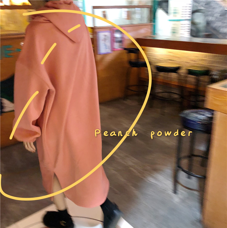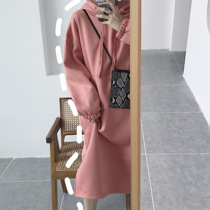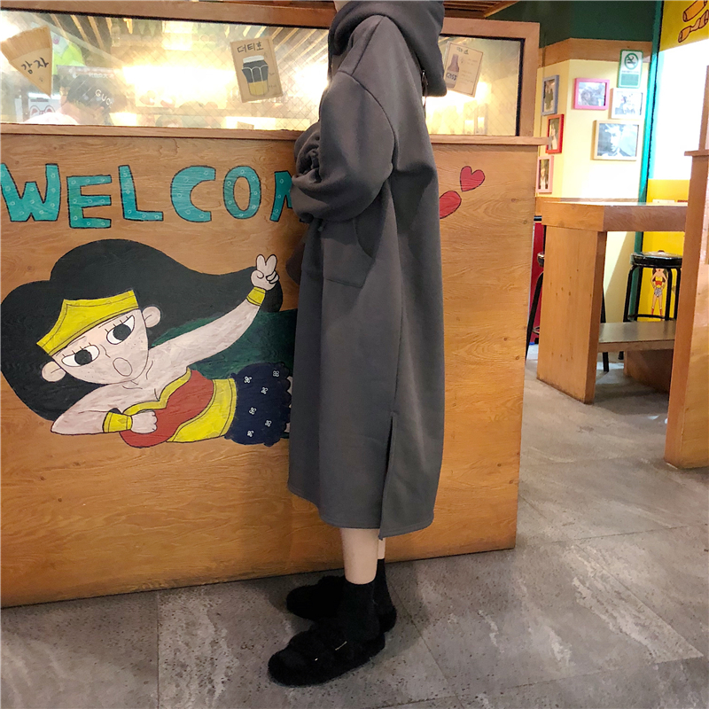 / 秋冬季慵懶風上衣女寬松百搭加厚加絨中長款寬松連帽衛衣女連衣裙