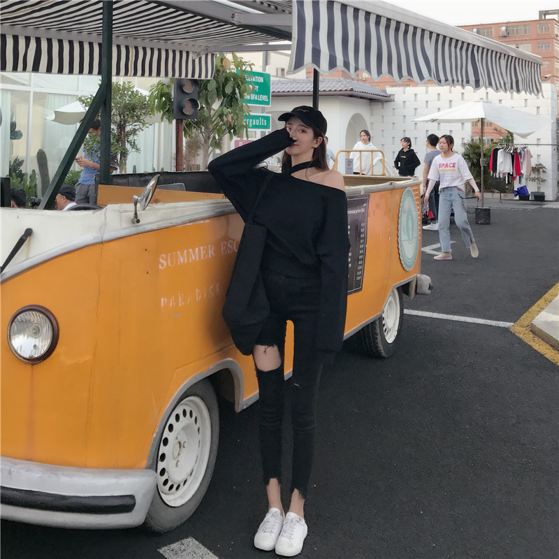 韓版簡約小心機斜露肩衛衣女+百搭高腰顯瘦割破牛仔小腳褲兩件套