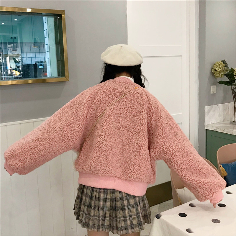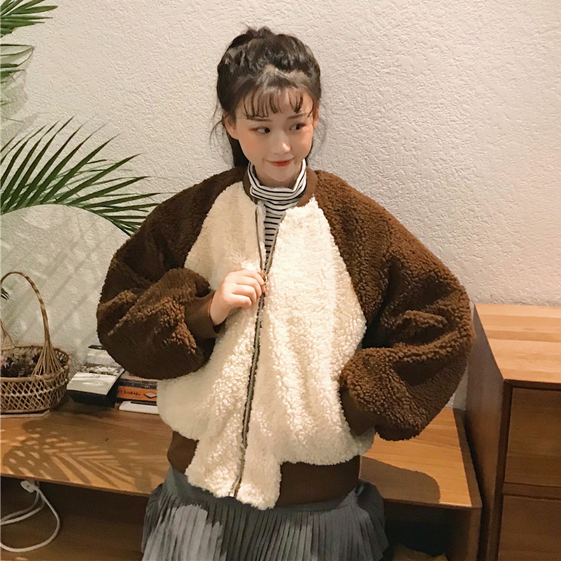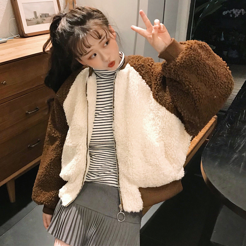 學院風撞色仿羊羔毛棒球服女秋冬裝2018新款韓版寬松長袖棉衣外套