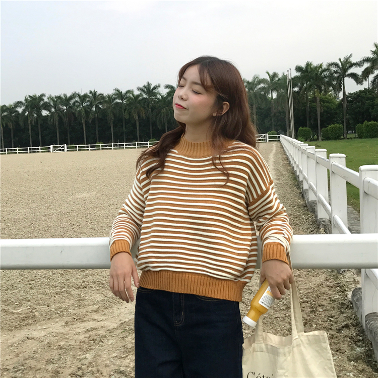 秋季女裝韓版慵懶風寬松條紋半高領套頭長袖毛衣針織衫上衣外套潮