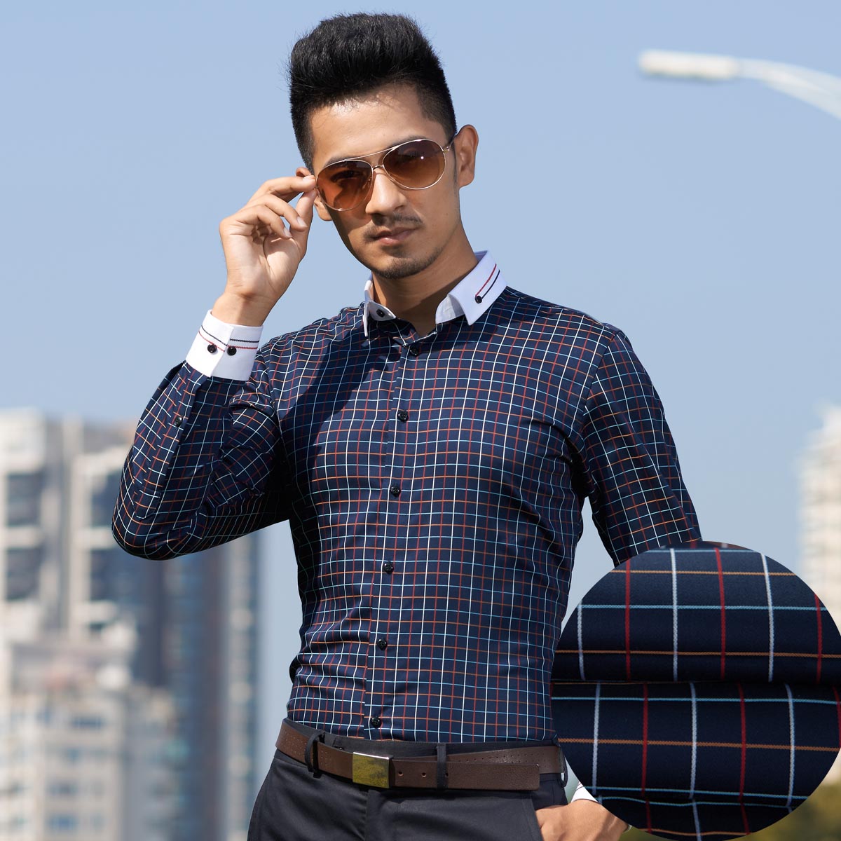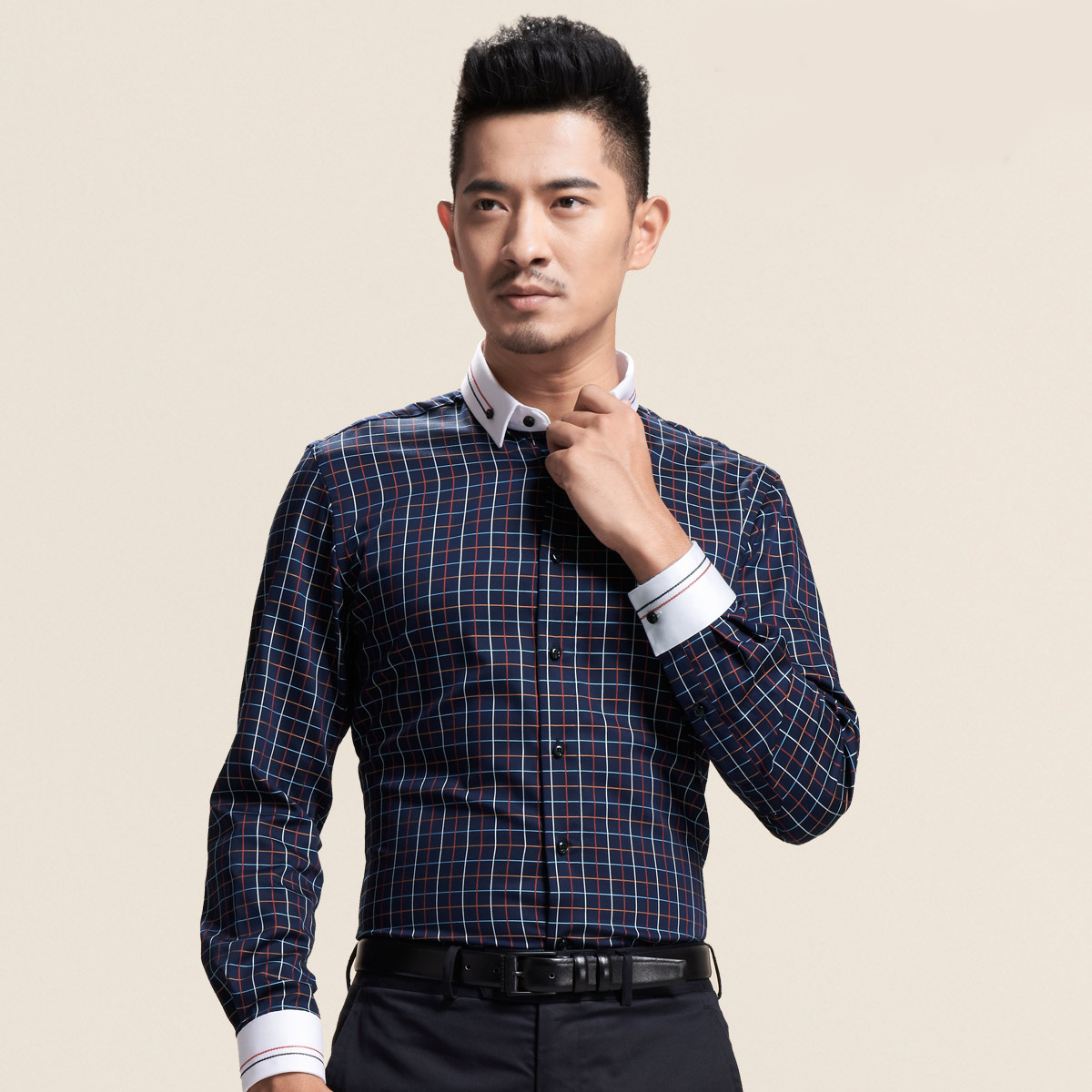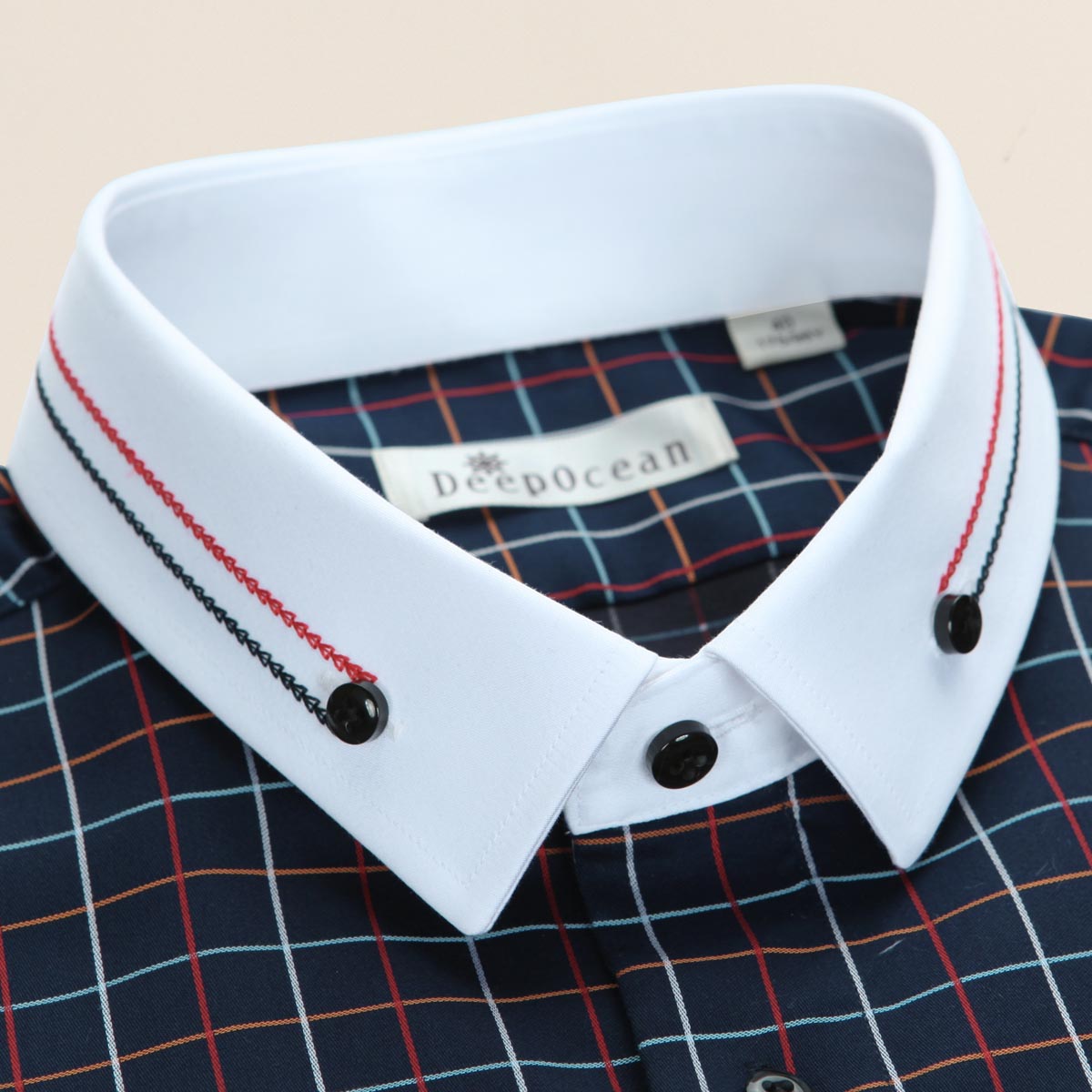 深海秋裝男士襯衣修身型襯衫男長袖青少年韓版純棉異色領格子男裝