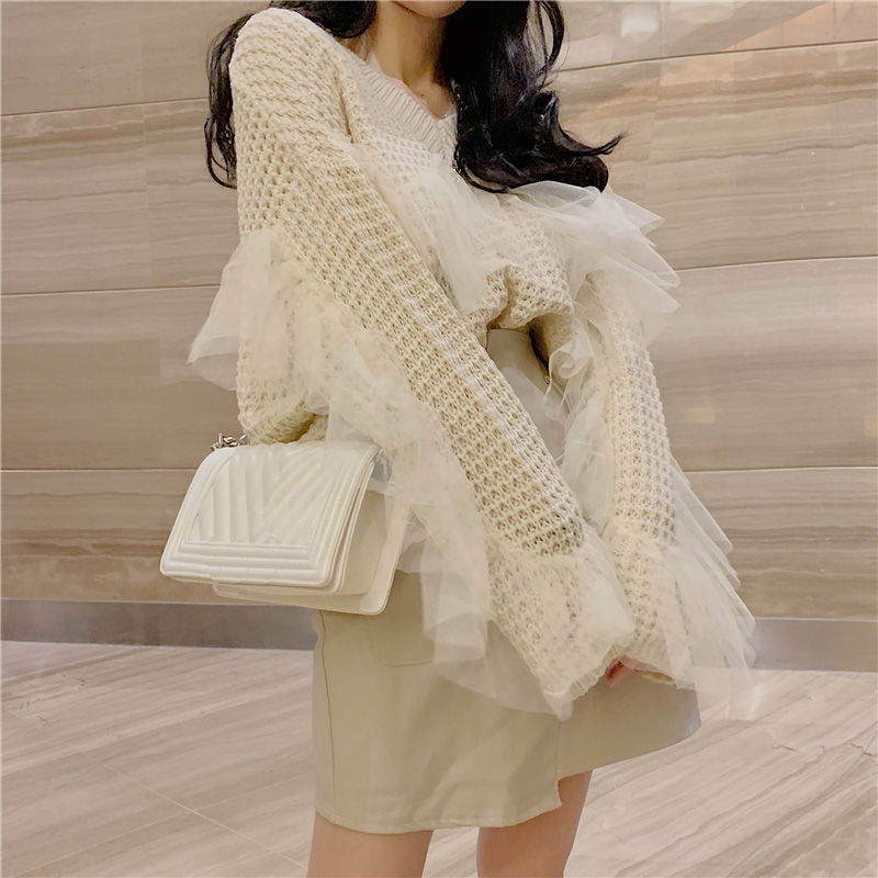 / 秋冬新款時尚甜美網紗拼接V領套頭寬松針織衫百搭純色長袖毛衣女
