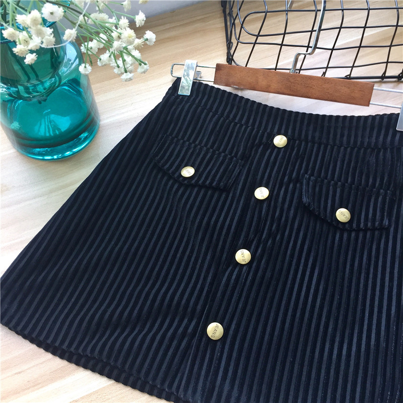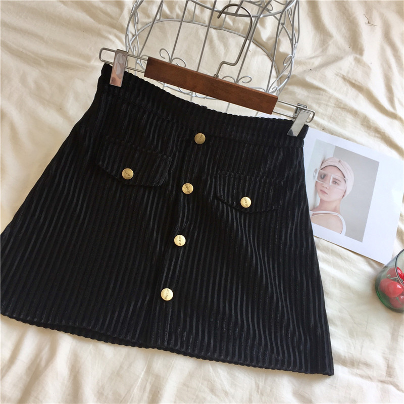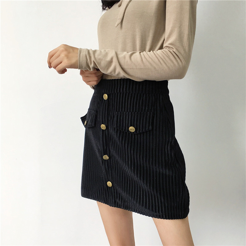 / 時尚燈芯絨條紋包臀短裙秋裝女新款顯瘦高腰排扣黑色a字半身裙子