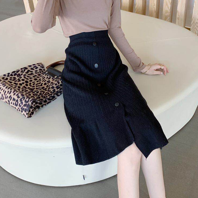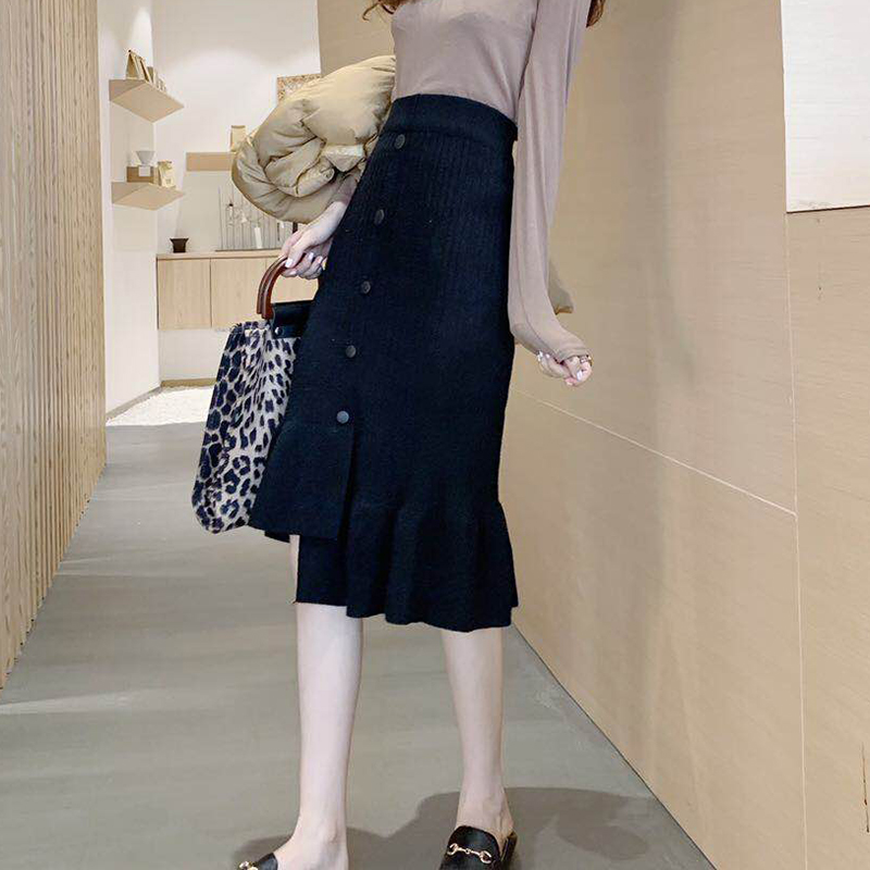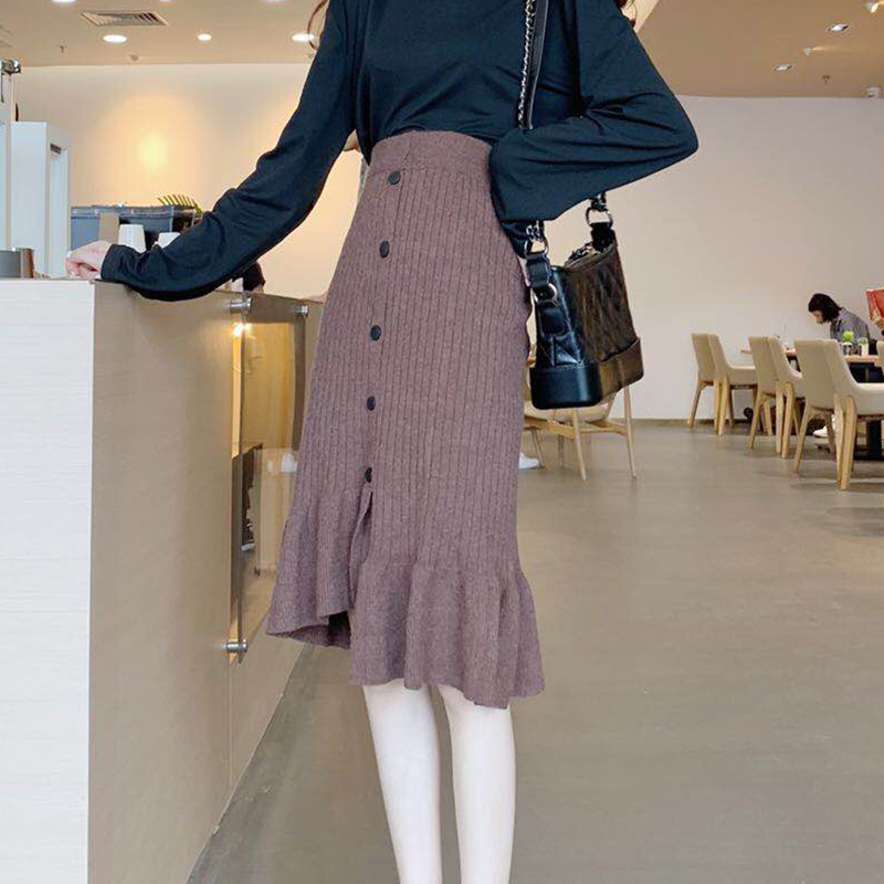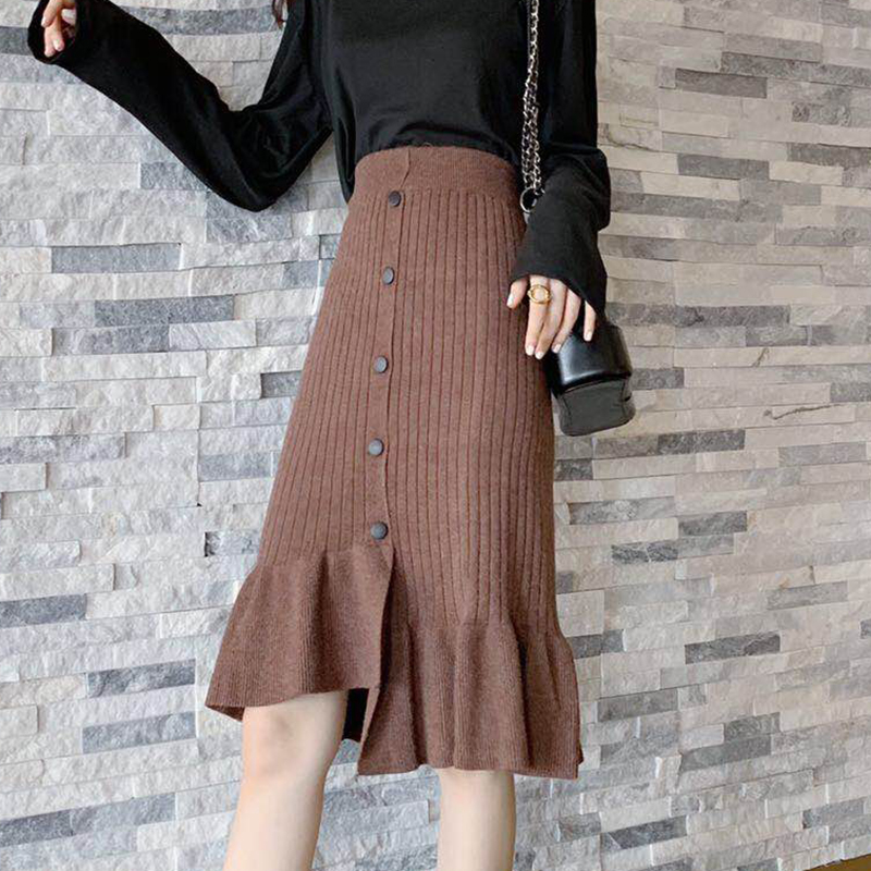 / 不規則針織半身裙秋冬新款女裝顯瘦時尚高腰排扣荷葉a字中長裙子