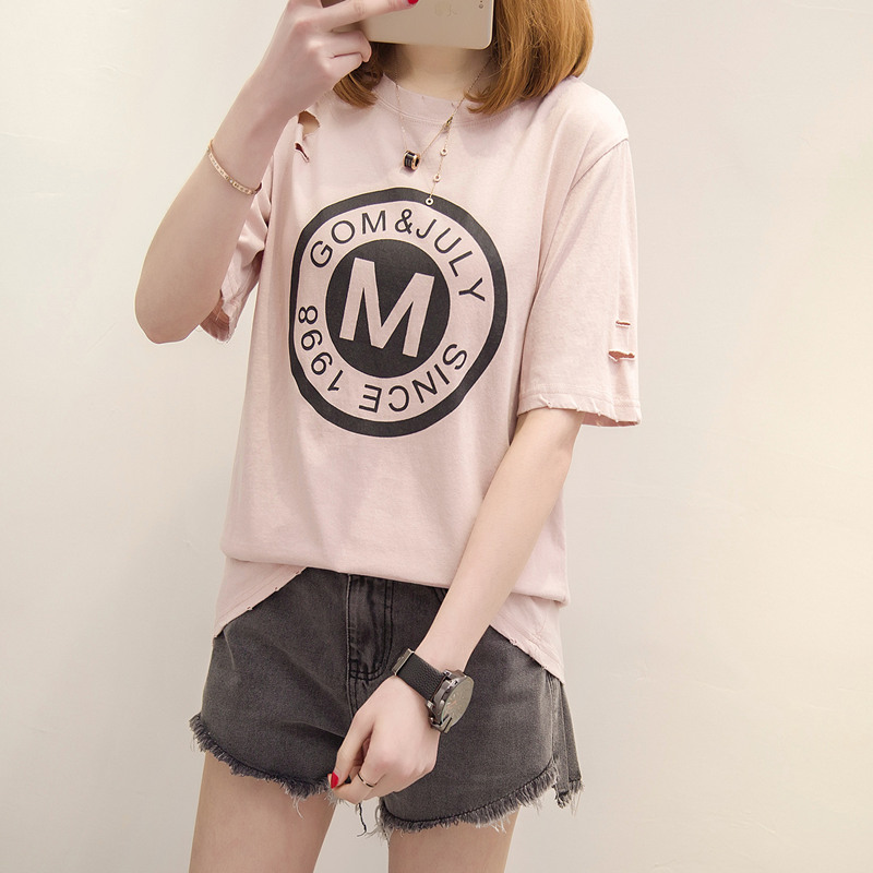 / 新款潮韓版春季女裝短袖t恤女寬松破洞韓版學生上衣體恤打底