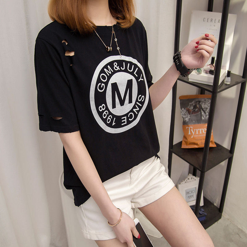 新款潮韓版春季女裝短袖t恤女寬松破洞韓版學生上衣體恤打底