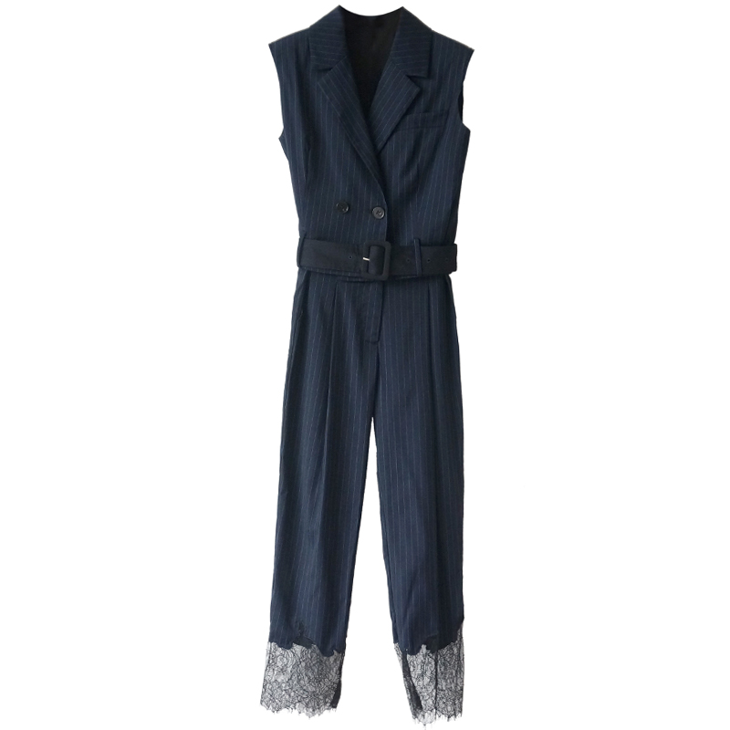 / 歐洲站2018夏新款高腰條紋無袖上衣蕾絲拼接七分褲子套裝兩件套潮