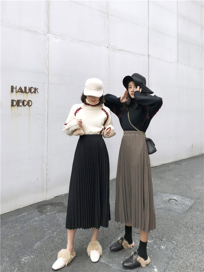 復古時尚女裝高腰針織半身裙秋冬2018新款中長款顯瘦A字百褶裙潮