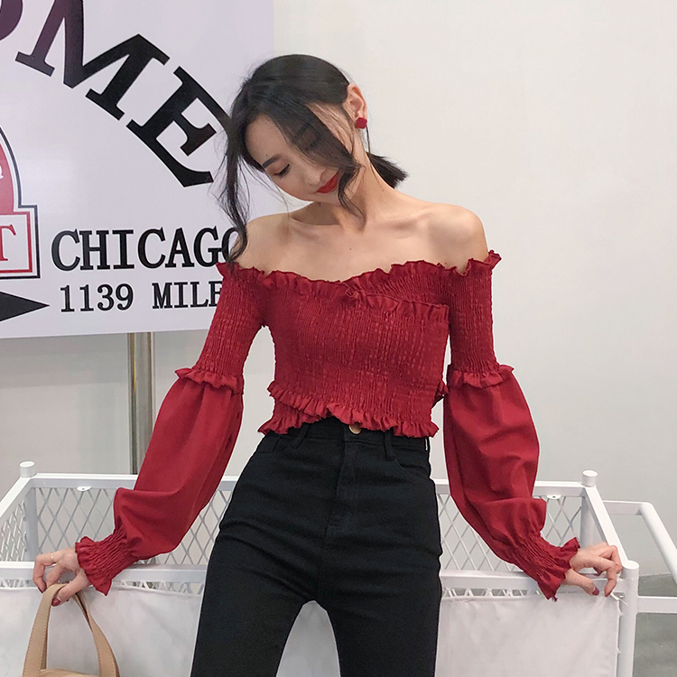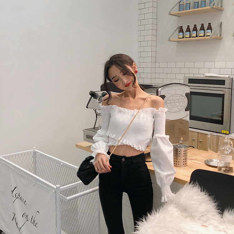 / 韓國新款落肩花邊交叉一字肩時尚純色百搭小心機拼袖短款chic上衣