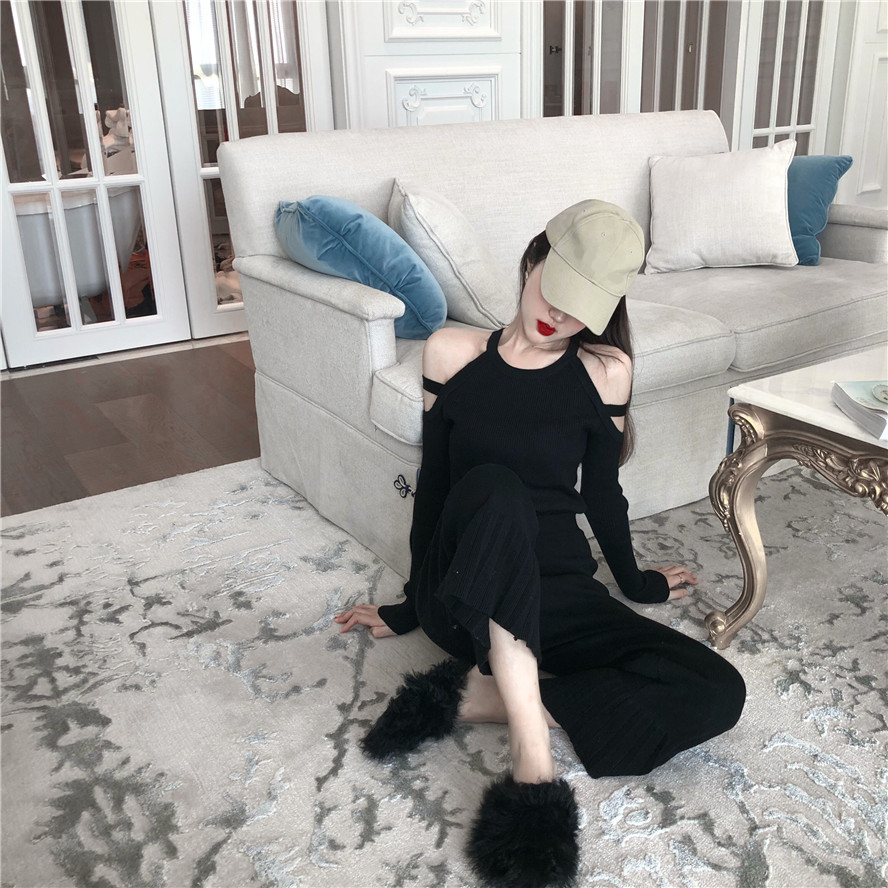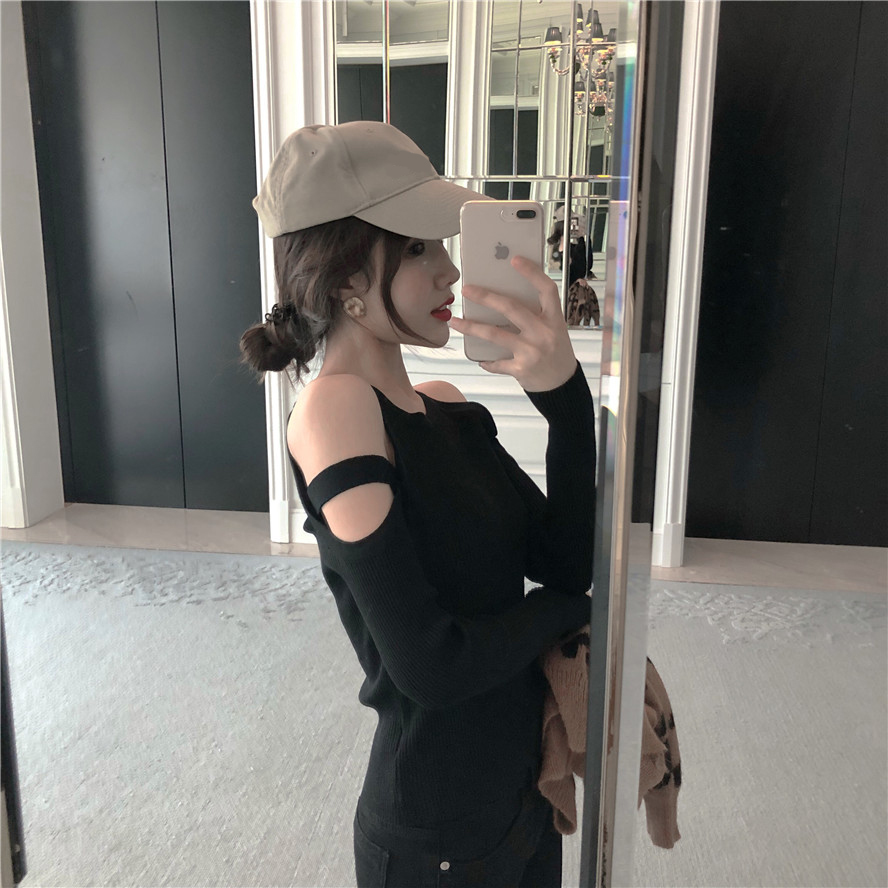 / 秋冬新款網紅同款性感氣質修身顯瘦小心機鏤空露肩長袖針織衫女潮